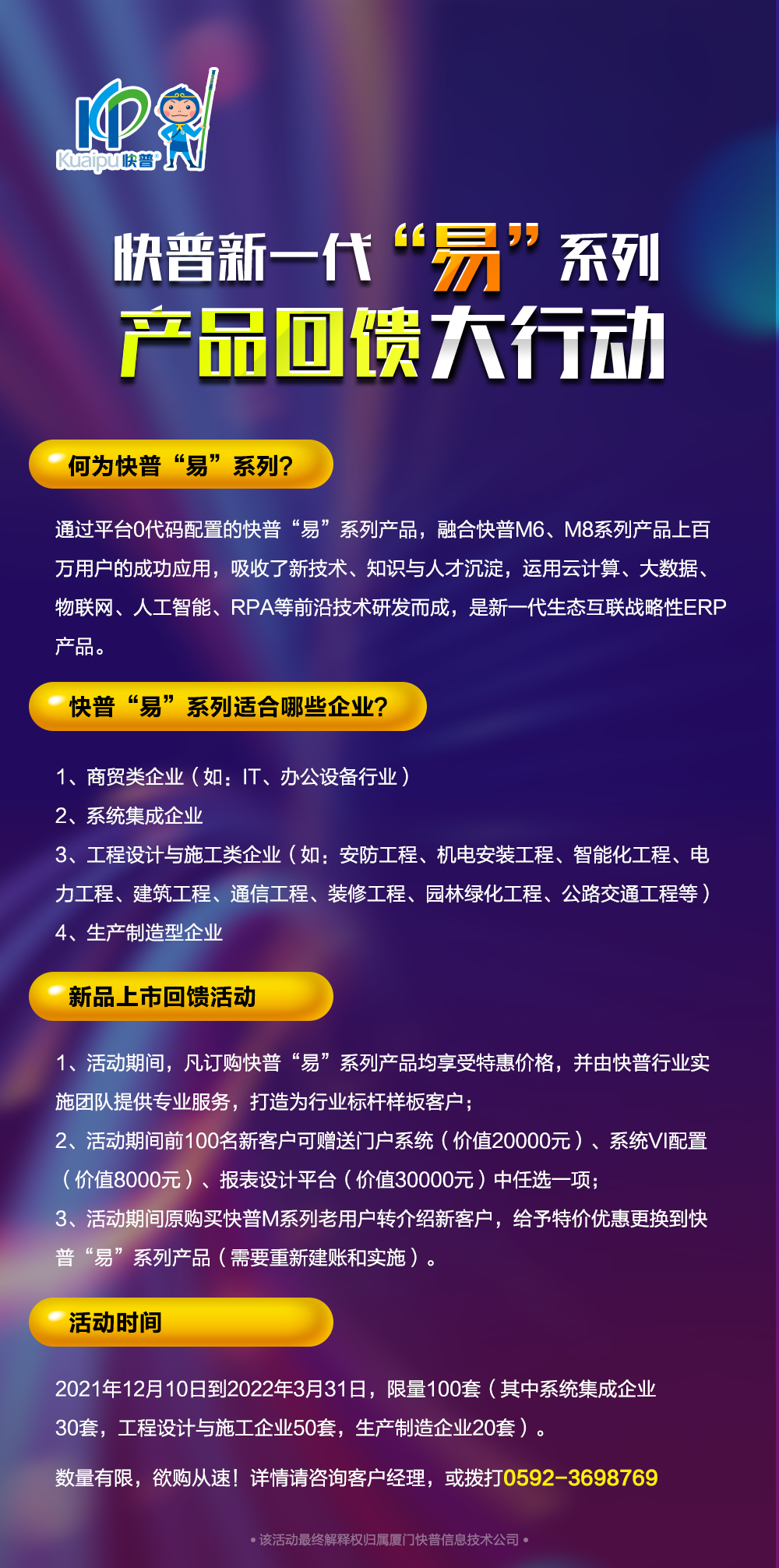 為了讓更多客戶搶先體驗快普“易”系列產(chǎn)品,現(xiàn)推出“限量優(yōu)惠回饋大行動”。希望借助本次活動幫助更多企業(yè)在新財年實現(xiàn)管理升級、業(yè)務(wù)轉(zhuǎn)型;在別人觀望等待時,變“危機”為機會,在應(yīng)對競爭格局中尋求突破,取得又好又快的發(fā)展。