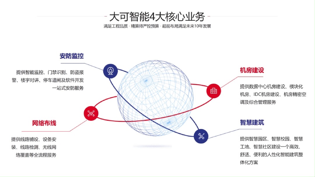 江蘇大可智能工程有限公司(以下簡稱“江蘇大可”)成立于 2010 年,是一家領(lǐng)先的弱電智能化系統(tǒng)綜合方案提供商,專注智慧建筑整體解決方案設(shè)計(jì)與施工,以及大型企業(yè)弱電系統(tǒng)集成,包括安全防范系統(tǒng)、網(wǎng)絡(luò)綜合布線系統(tǒng)、核心機(jī)房工程、多媒體廣播系統(tǒng)、智能樓宇控制系統(tǒng)等,同時(shí)圍繞集成項(xiàng)目開展銷售和運(yùn)維服務(wù)。